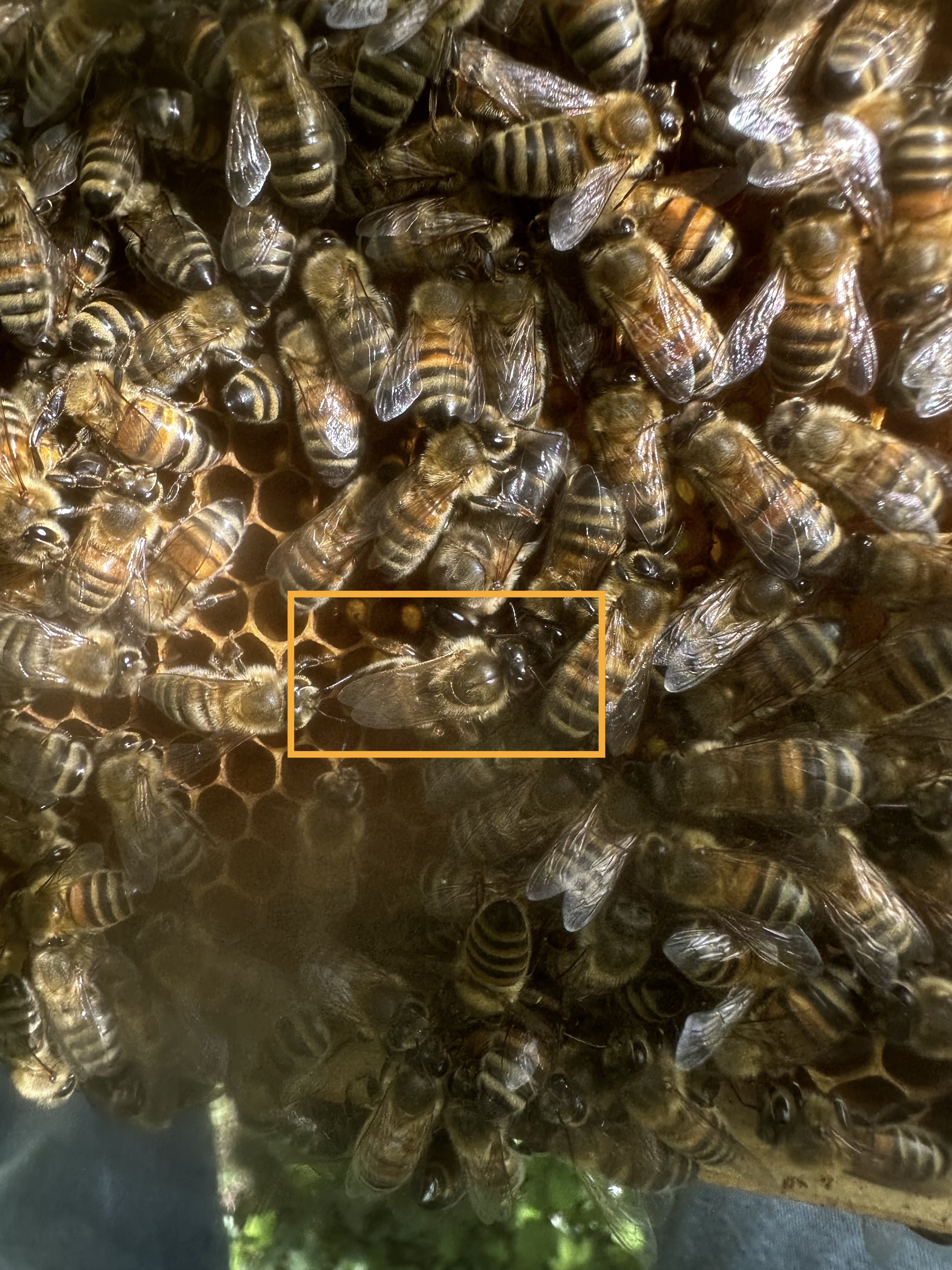 Mit der heutigen Durchsicht wurde auch die neue Jungkönigin mit der Jahresfarbe grün ausgezeichnet. Wie man im Bild sieht, überlebte die stille Königin den Königinnenschlüpftag. Diese stille Jungkönigin vereint als F1-Hybride Merkmale der Buckfast und der italienischen Biene. die italienische Biene (apis melifera ligustica) ursprünglich auf der Appenin-Halbinsel von Südtirol bis Kalabrien beheimatet (Engfer 2024), ist mittlerweile weltweit gehalten. Sie gälte als beste Sammlerin von Nektarhonigen und sie sei friedfertig (Engfer 2024, Honigbauer 2015). Die Körperfarbe der Arbeiterinnen variiert zwischen zitronengelb und ledrig-braun. (Zünddorf 2023) wobei die Königinnen durchweg orange erscheinen (Engfer 2024). Sie gälte als mittlerweile weltweit häufigst gehaltene Honigbiene und soll sogar in Alaska und Skandinavien erfolgreich Honig sammeln (Zünddorf 2023). Sie ist wie die Buckfast und Carnica eine Frühtrachtsammlerin (Engfer 2024), die sehr früh im zeitigen Frühjahr mit dem Sammeln Nektarhonig beginnt.