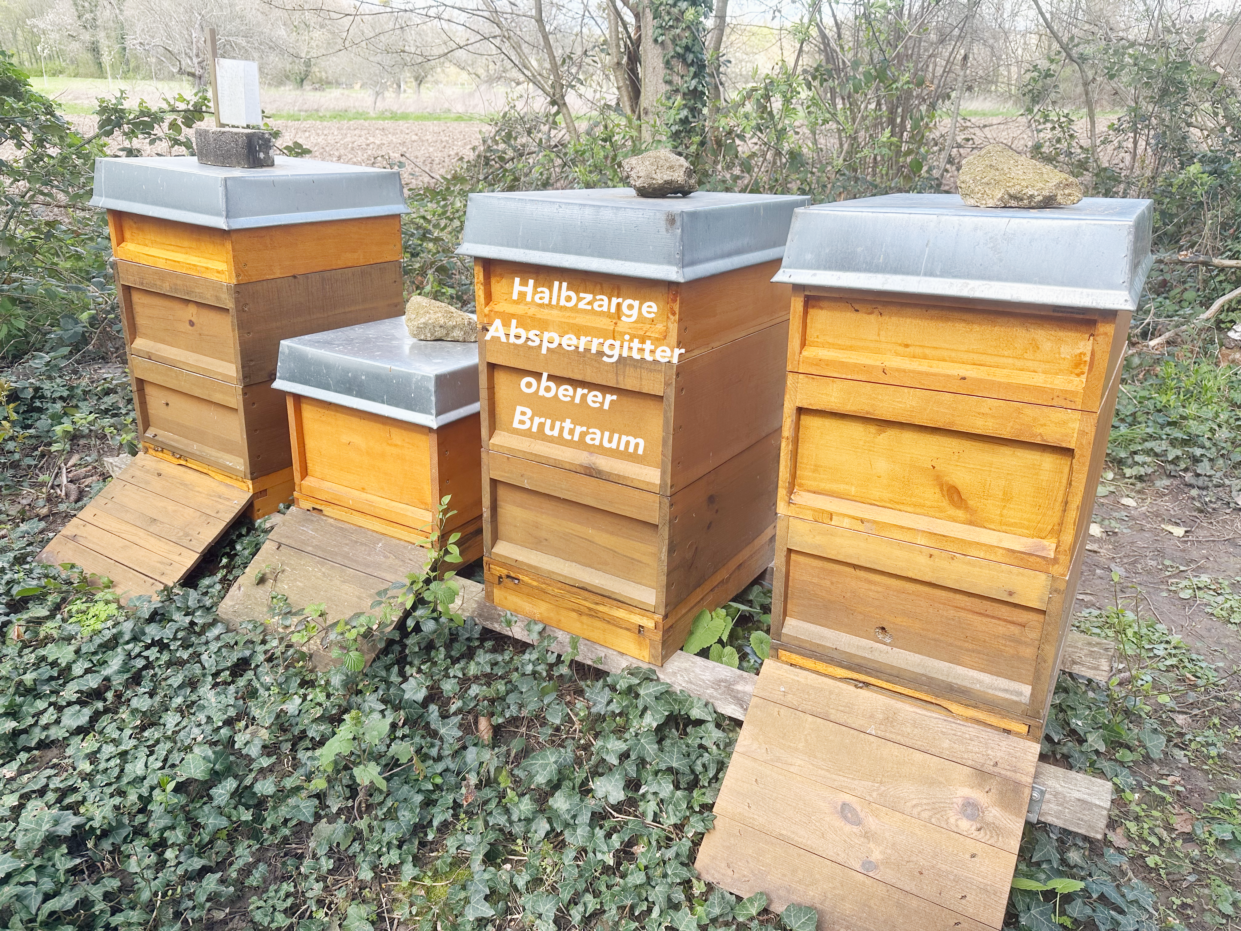Die fertige Erweiterung zeigt in meinem Fall nun ein zweieinhalbstöckiger Bienenstock mit Absperrgitter, zwei Bruträumen und einer Halbzarge als Honigraum. Die Halbzarge ist eine halbhohe Zanderbeute. Ich habe die Erfahrung gemacht, dass Halbzargen im frühen Frühjahr schneller mit Honig gefüllt und verdeckelt sind. Manchmal ging das Füllen der Vollzargen bis kurz vor den nächsten Trachtwechsel, Das ist natürlich schlecht, da man Mischhonige als Imker eigentlich vermeiden möchte, wenn man sie nicht gerade gezielt produziert.