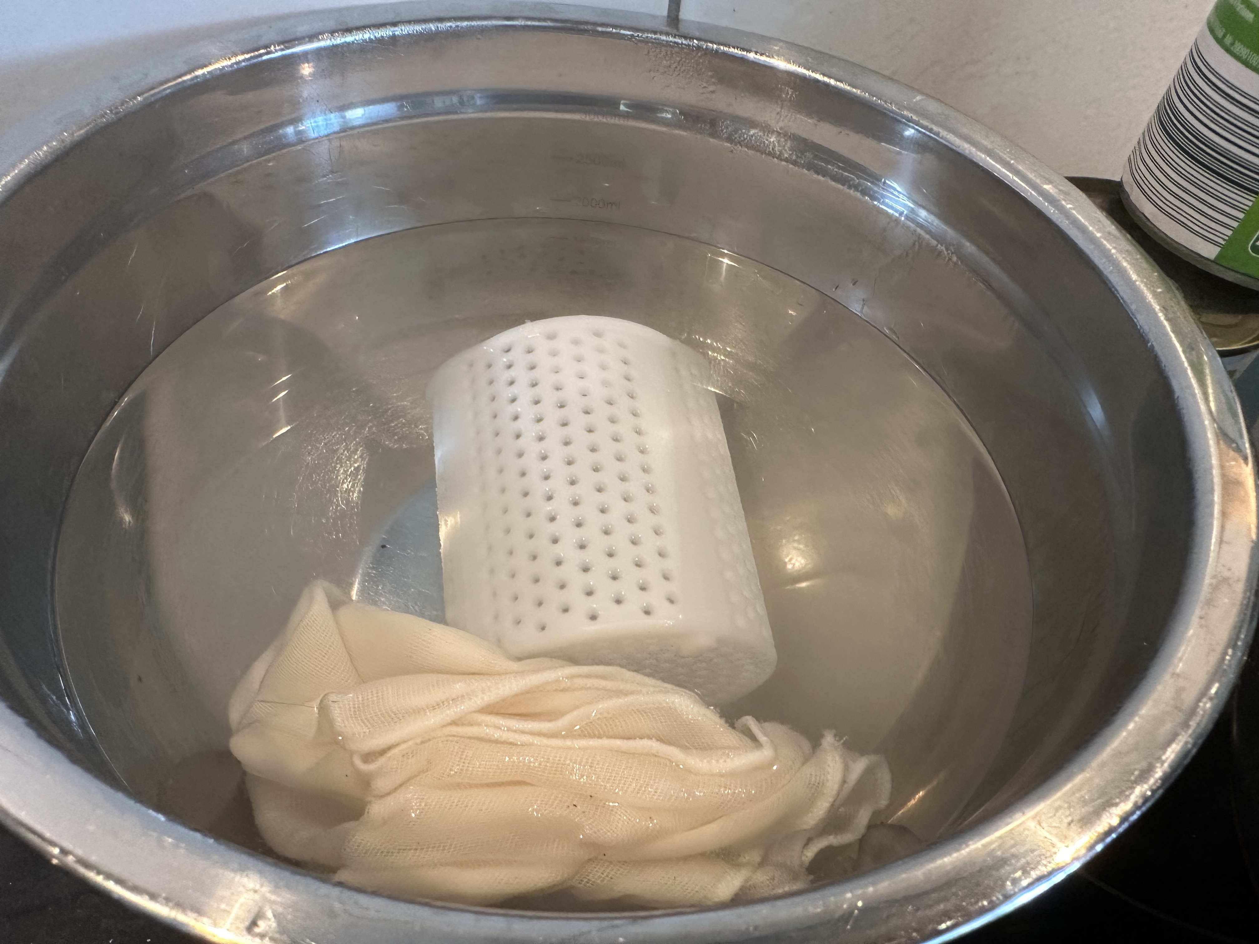 Da man schon heißes Wasser zubereitet, können auch die anderen Utensilien zur Käseherstellung mit heißem Wasser sterilisiert werden. Das Überbrühen mit heißem Wasser der Kochutensilien hat auch den Vorteil, dass evtl. Seifenreste von den Utensilien gespült werden.