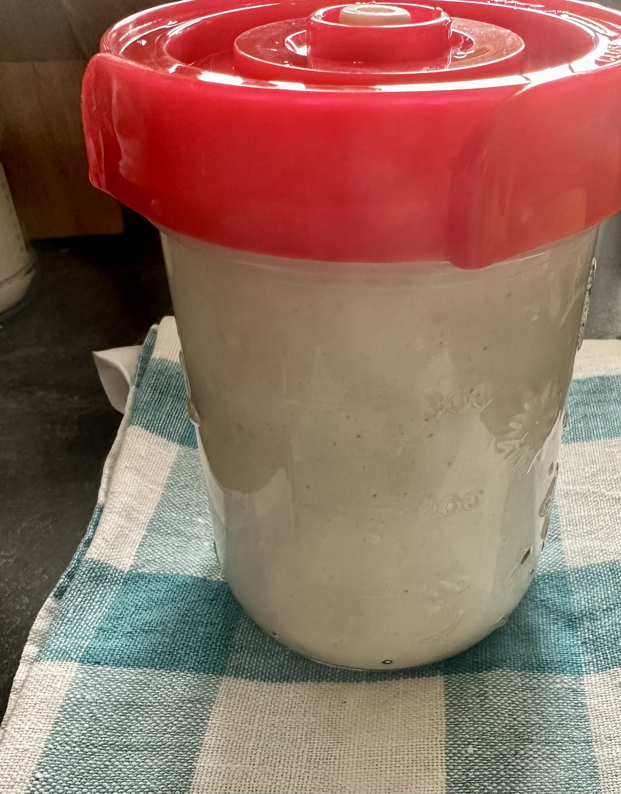 Gärgefäß mit GärdeckelIst die Cashewmasse in das Fermetnationsgefäß verfüllt und auf unter 45 °C abgekühlt, kann beimpft werden. Es genügen 2 gestrichene Messlöffel für das Beimpfen der Cashewmasse mit der Bakterienkultur. Um ideale Bedingungen für die Milchsäurebakterien zu schaffen, benutze ich einen Gärdeckel, mit dessen Hilfe ich auch Luft aus dem Gärgefäß pumpen kann. Das Entfernen der Luft aus dem Gärgefäß entfernt auch den Sauerstoff, der von anderen Bakterien als den Milchsäurebakterien für ihren Stoffwechsel und damit auch für ihr Wachstum genutzt wird und schafft ein nochmal besseres Milieu für die Milchsäurebakterien, die die Rohmasse in Käse verwandeln soll.