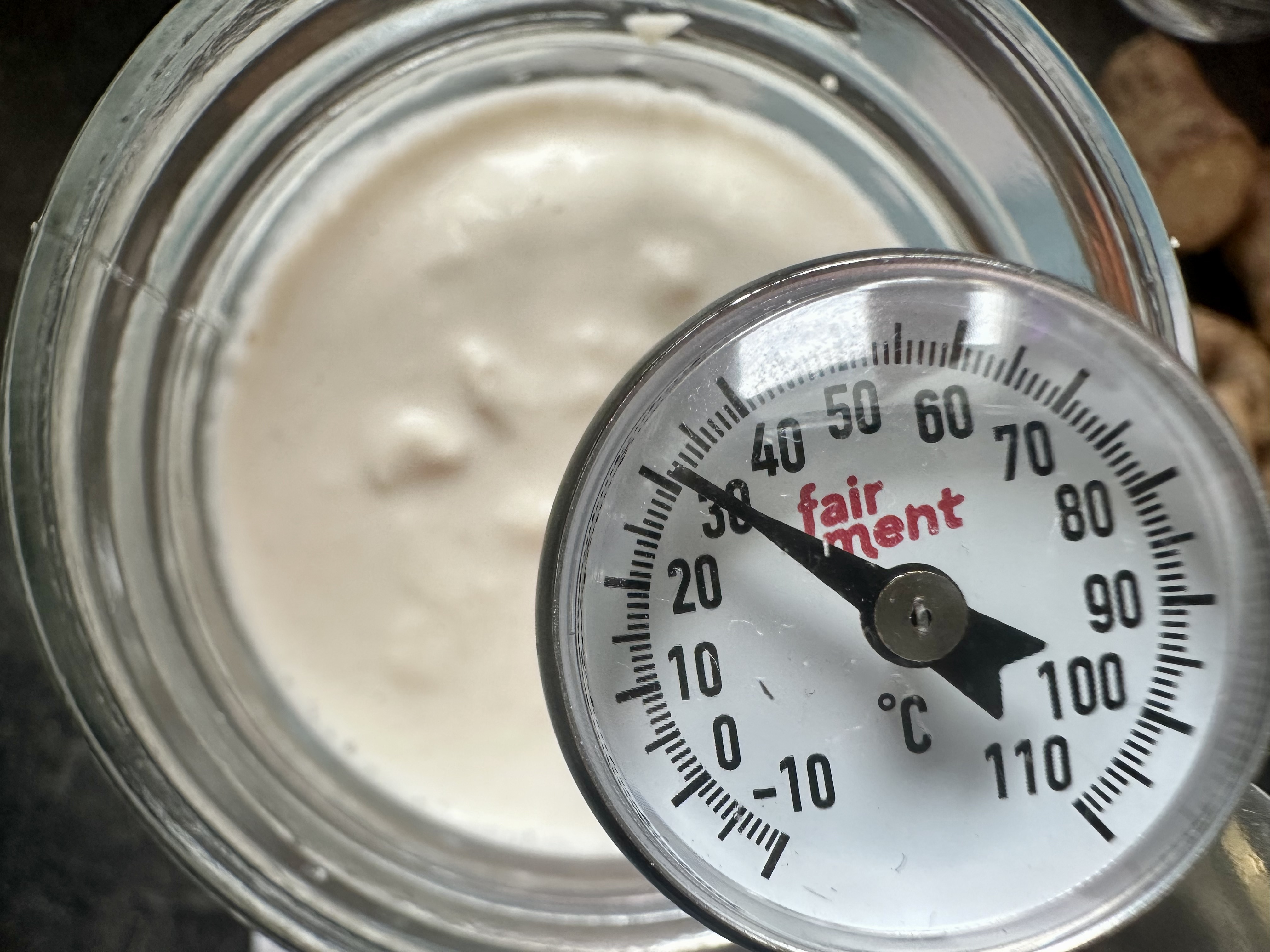 Meine Cashewmasse hatte knapp 30 °C also alles im grünen Bereich. Auf geht's zum Beimpfen.